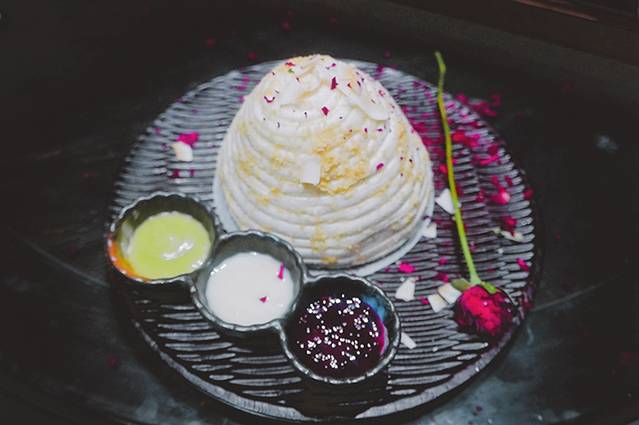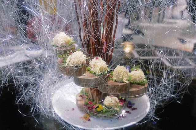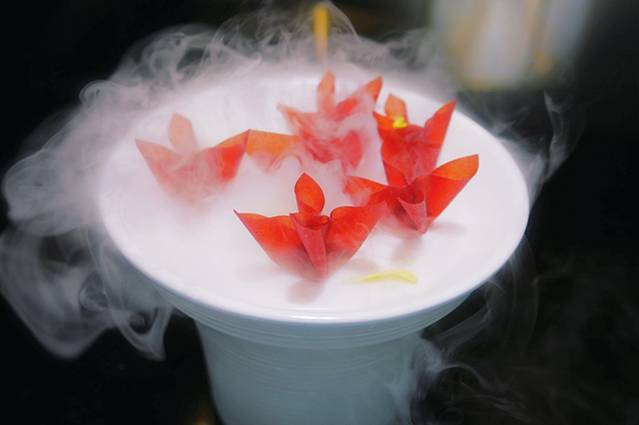 手工奶香花卷:充满仪式感的花卷,蘸满干冰的玫瑰花🌹用手轻轻一拍,碎花瓣缓缓飘落,画卷入口有股淡淡的香甜,三种不同口味的蘸料更是一绝。