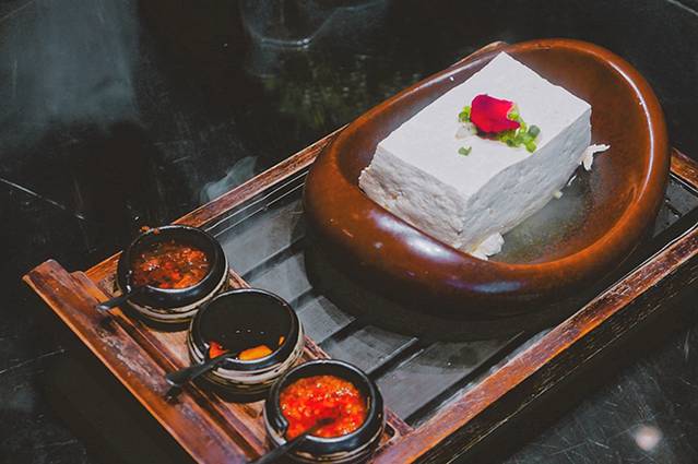 石磨一块豆腐:餐厅必点菜品,采用传统的制作手法,蘸上秘制酱料,口感细腻,营养美味。