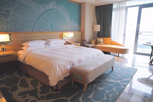 房间是以蓝、白为主色调的海洋风设计,细节布置温馨,洗、卫、浴干湿分离,洗护用品是以色列国宝级品AHAVA,有专门的成人款和儿童款,房间阳台很大,视野开阔,可以俯瞰海棠湾海景和整个水世界。