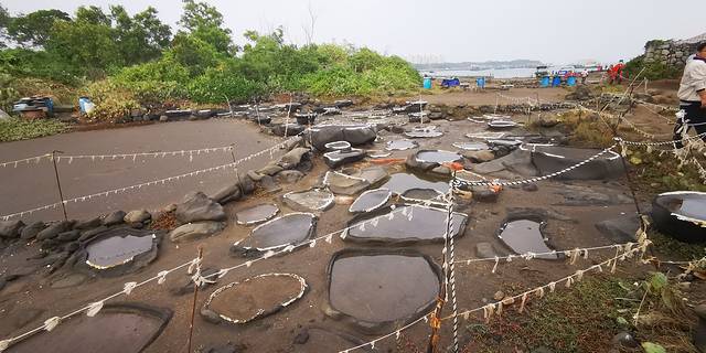 千年古盐田位于海南儋州洋浦半岛盐田村。1200多年前的唐末年间,一群福建莆田的盐工不知什么原因,千辛万苦迁居到当时海南岛西部的古儋耳郡,在洋浦半岛的海边开山辟石,建造家园和盐田。他们的盐田十分独特,将海边大片的天然火山岩石削去一半,在石头顶部除四周留出凸边外,把中间打磨平滑,做成石槽。平时在这些石槽中注入经海泥过滤后的海水(涨潮时海水就会自动漫入这些盐槽),靠阳光晒出高品质的食用盐。由于这种方式开创了高产量的“日晒制盐”的先河,清朝乾隆皇帝曾御书“正德”赐给这些盐田人,后来人们也称这里为“千年古盐田”、“新英古盐田”。景色也是一般一般,但其历史却值得一观。
