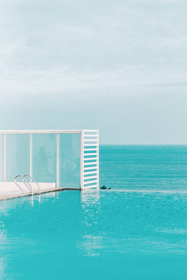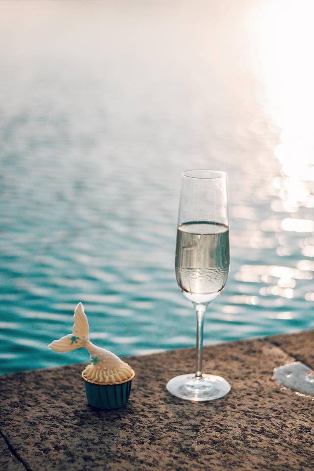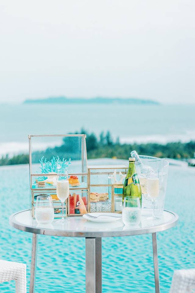 再配上一套专属的海洋主题的下午茶,香槟和美景更配,一定是度假最休闲的打开方式,如果你也呆到日落时刻,一定和我一样,不想离开。甜品整体是Tiffany蓝色调,精致得让人不忍下口破坏,背景是无人的清澈泳池,在连轴转的日子里,不如停下来享受片刻的宁静。