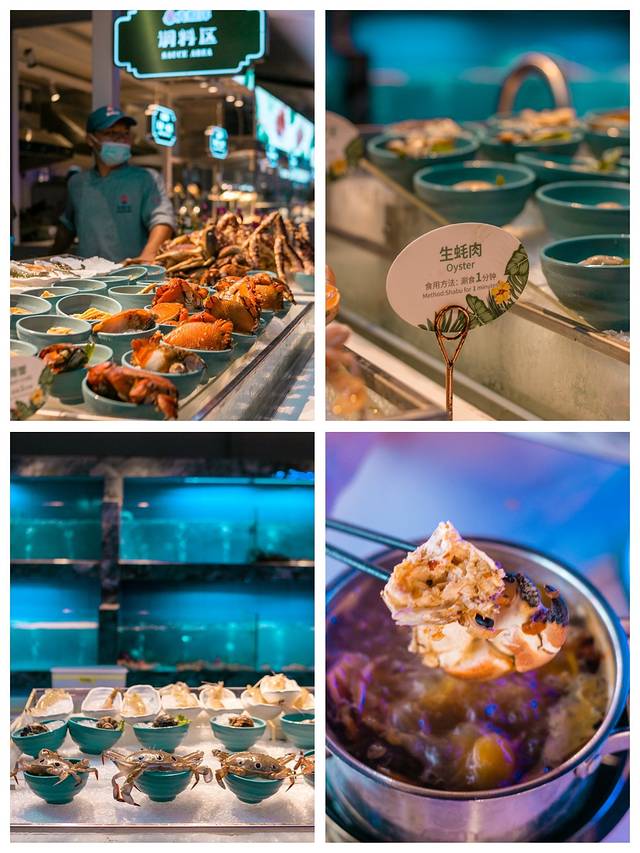 来一场梦幻浪漫的海鲜盛宴!来三亚,很多人都会迷失在海鲜的品种繁多之中,所以海鲜自助是个不错的选择,作为三亚海鲜自助的NO.1,慕名而来这家大悦洋海鲜餐厅,还没选上菜呢,先是被各种装置吸引,下午五点半才开始影业,灯光和背景音乐的加持,仙儿气十足,仿佛置身海洋深处。