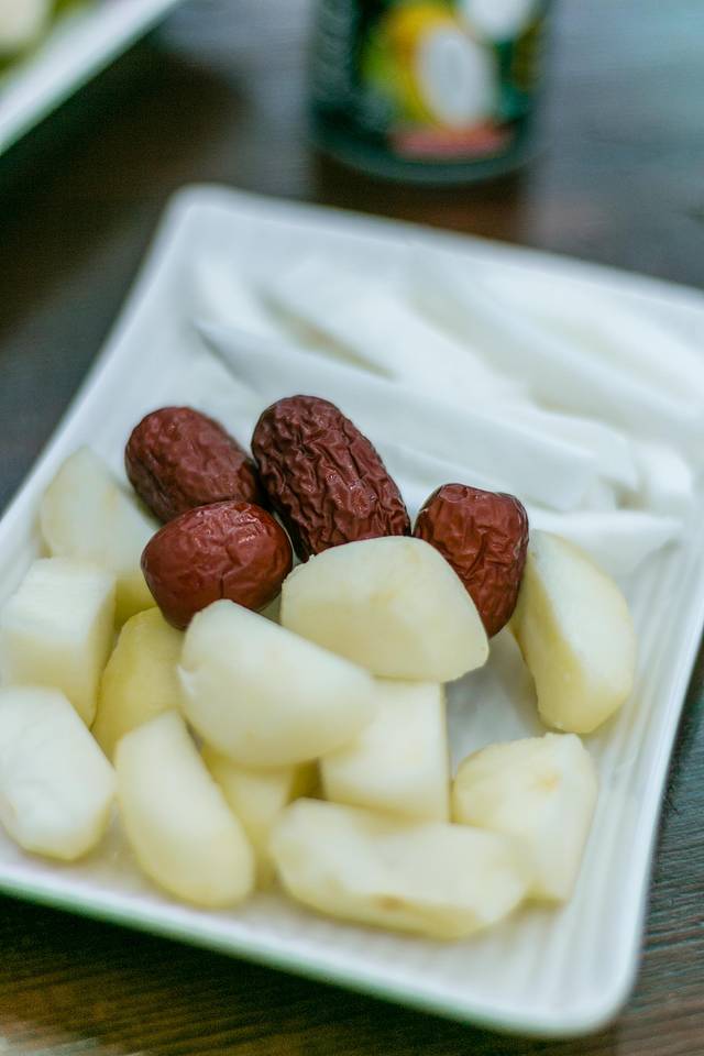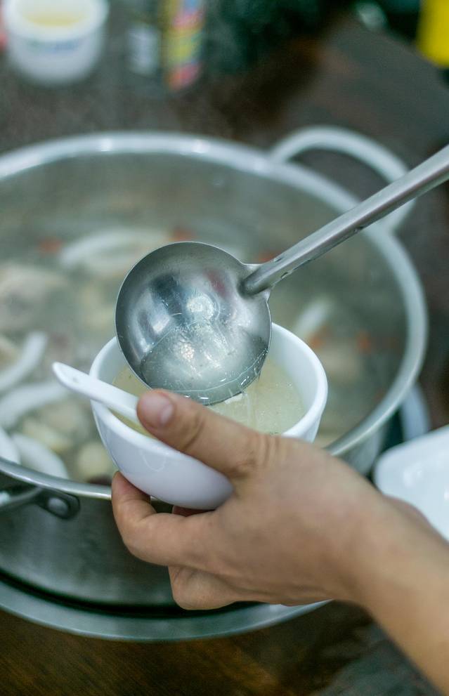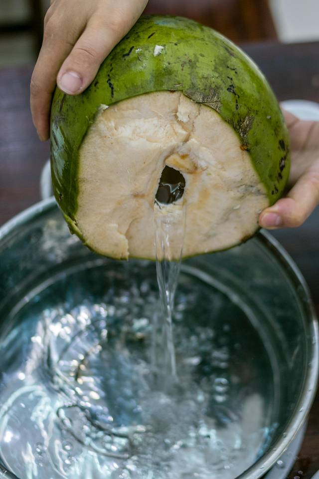 开一整颗新鲜椰子汁倒入锅中,保持住了椰汁的纯正香甜。据说海南一直有「无鸡不成席」的习俗,吃鸡是这里的传统饮食,而且必须是文昌鸡。再加入马蹄、椰肉、枸杞、红枣,汤底将椰子汁的清香和各味调料融合,再加上鸡肉的鲜嫩,这碗汤还没到嘴里,都是想得到的滋补美味。