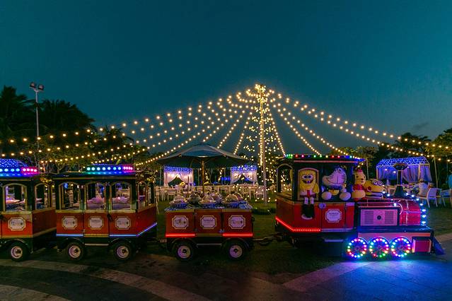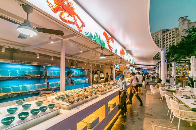 有人说「热带的天是上帝的宠儿」,在无边泳池看过夕阳,并没有给晚上安排行程,想着在酒店吃个海鲜烧烤自助晚餐,没想到威斯汀的水汀海岸餐厅搭建起了灯带,户外主题餐厅360度亲近自然,靠近海棠湾边,所以因此得名吧。