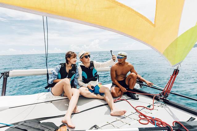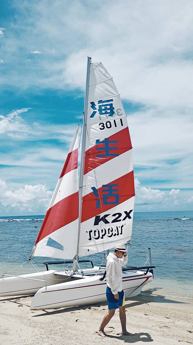 双体帆船是双体船体结构,所以动力全靠风力,会在海面行驶过程中既有速度,又很平稳,船上会配有一位船长和一个潜水教练,都非常专业,虽然是旱鸭子,但我也不用担心安全问题(悄悄地羡慕潜水教练的肌肉💪)