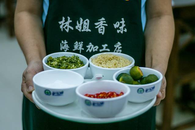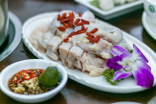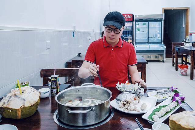 好几种调料搭配,酸甜可口,蘸一块文昌鸡,鸡肉入口之时,鲜香四溢在唇齿之间,服务员会在锅底再加入刚刚椰子里的嫩椰肉,原汁原味,椰子汤底越煮味道越发散发出来,整个餐厅都被椰子香弥漫了。