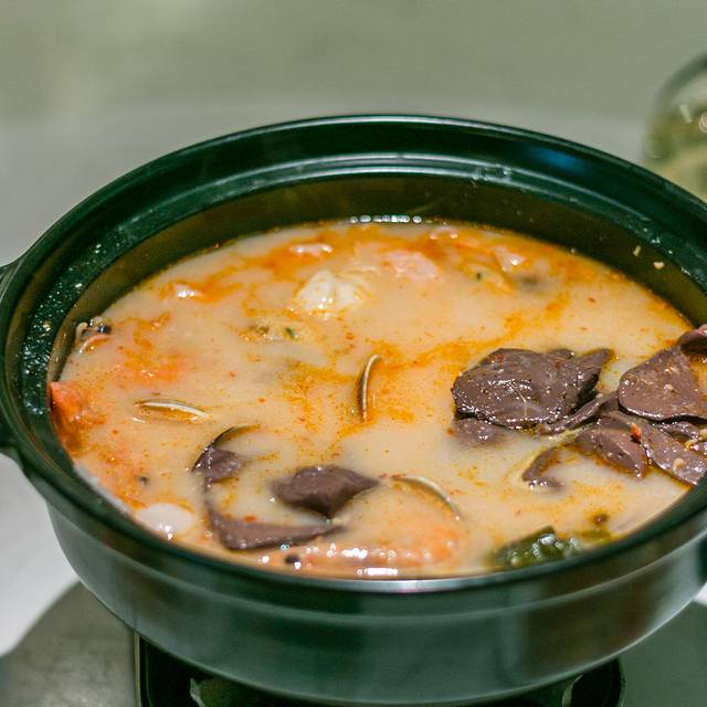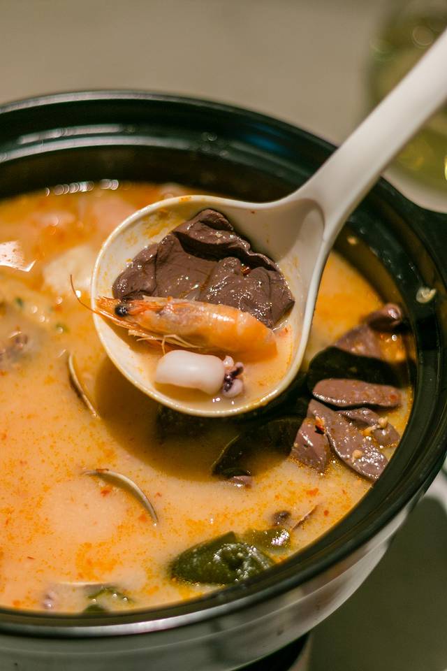 琼乡阁的菜品取材当地,在延续海南传统做法的同时,能够品尝着海南特有的山野风味,也加入了很多现代创新。不能错过的海南【海鲜糟粕醋】,乍一听名字还挺奇妙,其实是采用自然发酵的米糟产生的醋酸作为汤底,金黄色的汤里加入虾、墨鱼仔、鸭血等,酸辣开胃可口,打卡了别样的火锅体验。
