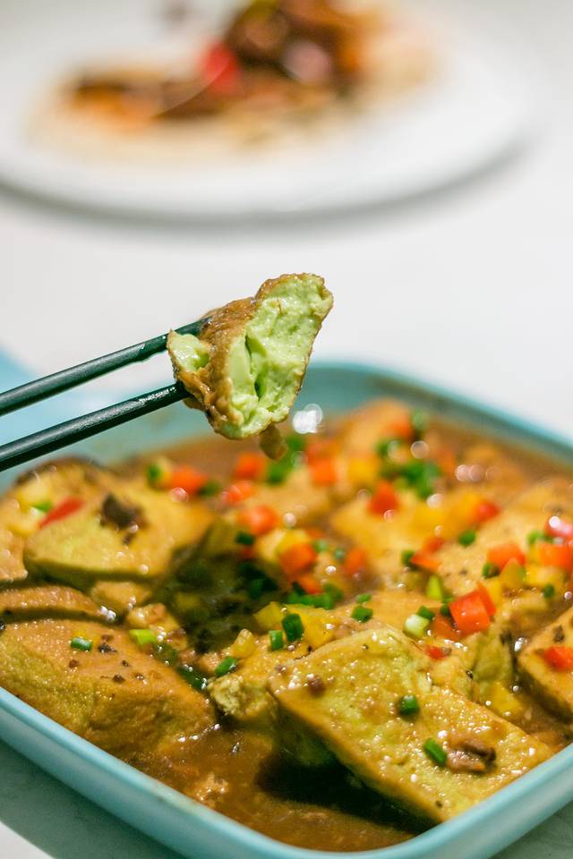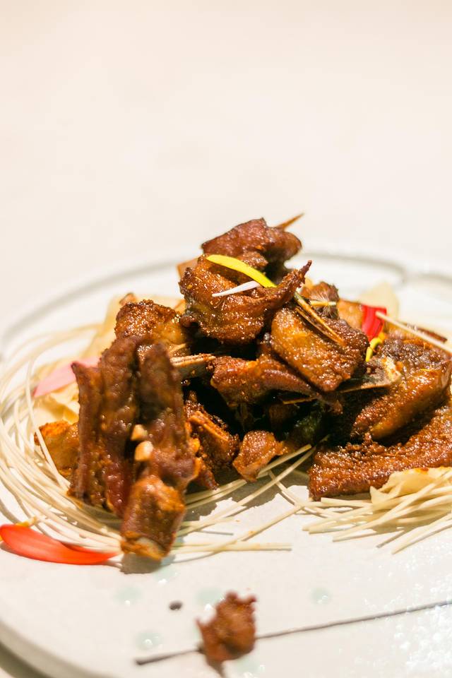 【孜然海南东山羊小排】也是特色之一,特色秘制之后,香脆可口,没有膻味哦~万万没想到很多人来这里都为了吃一口手工豆腐!看到每桌都摆了一盘,我们当然也要试试,传统手工做法,慢火熬制,嫩滑多汁,咬开竟然还是绿色的呢。