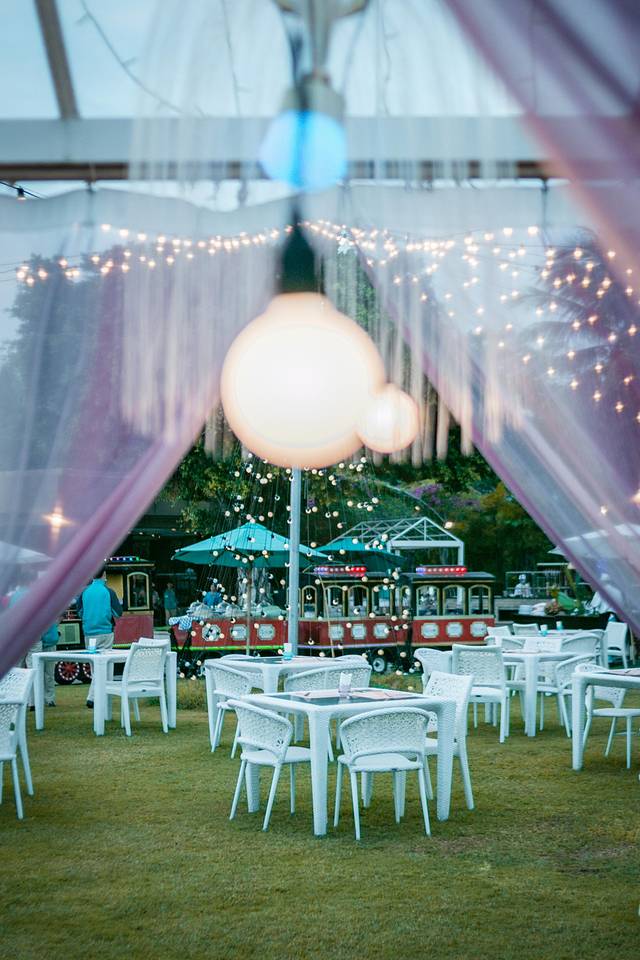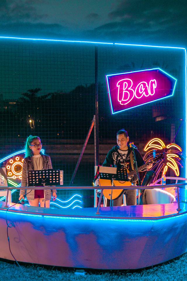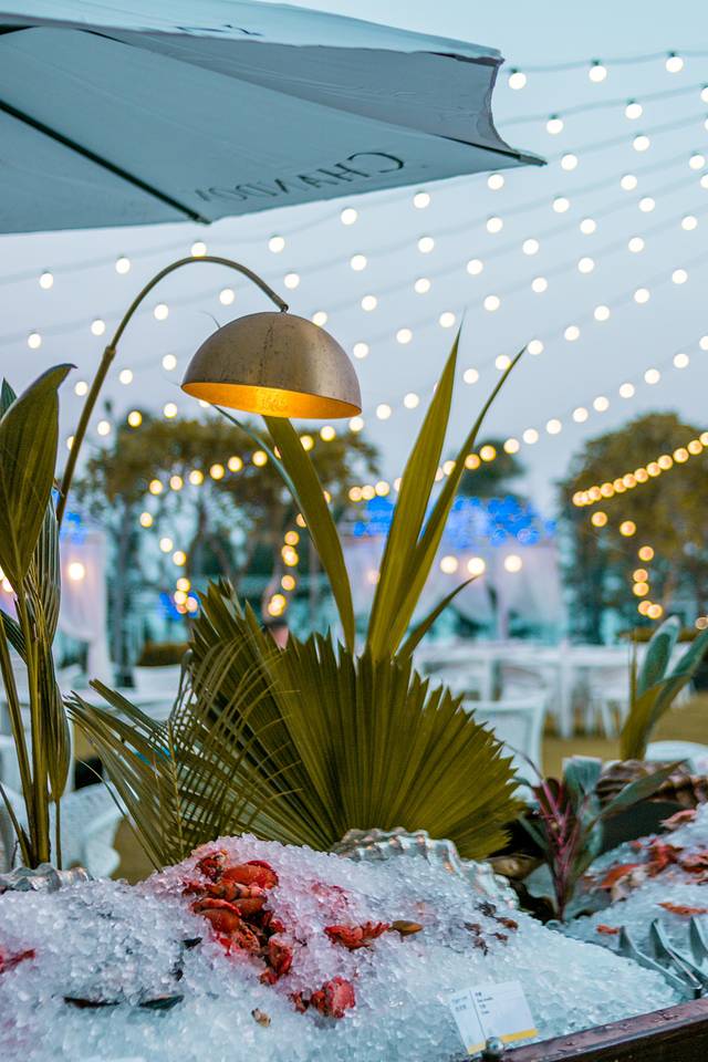有新鲜绿植叶为海鲜们“遮风挡雨”,还有灯带衬托下的梦幻的环境,轻纱棚架让气氛变得浪漫起来,低音炮的歌手和自助餐的烟火气相结合,为这片沙滩添了一丝情调。