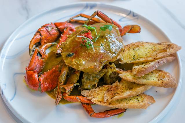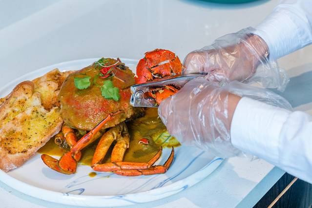 店内三种蟹可以选择:膏蟹、青蟹和珍宝蟹,论斤称重的价格毫不虚报。口味也有好几种,我们挑选的是【咸蛋黄炒蟹】,之前从没想过网红咸蛋黄酱搭配螃蟹会是什么口感,还可以选择胡椒、咖喱等,面包片蘸上浓郁的咸蛋黄酱,让我再次觉得咸蛋黄酱简直是万能搭配,新鲜嫩滑,只想把这个蟹肉打包带回家。