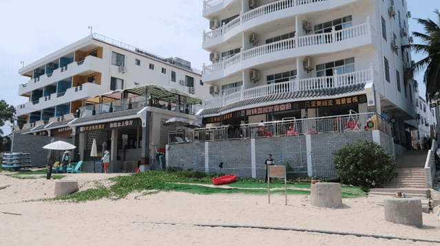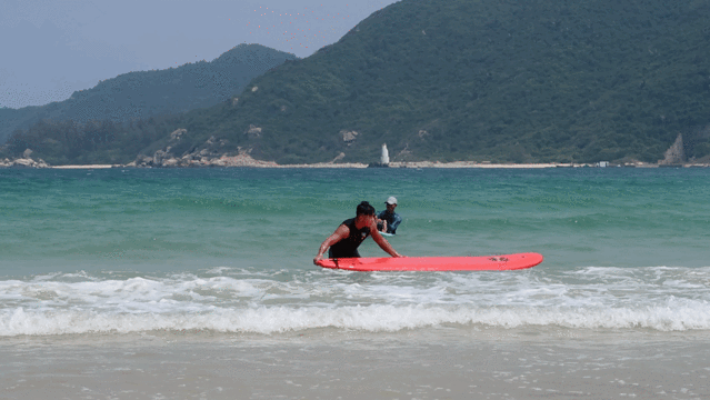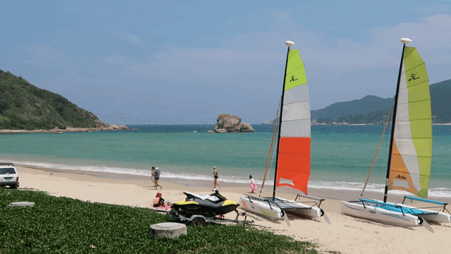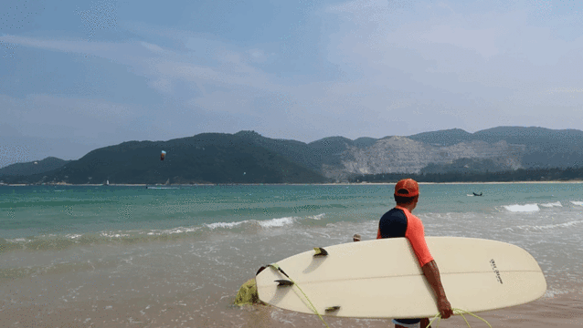 与昨天看到的海不同,后海村放眼望去,会被许多山隔档,但是还是有很多人会为了冲浪在这里呆上几天,毕竟这可是就是冲浪者的天堂。初级爱好者也可以去寻个体验店尝试一下,抱着帆板一路冲向海边吧~