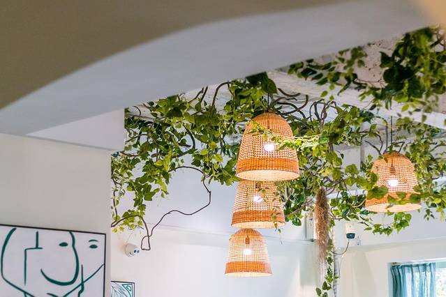 和印象中的海南菜馆不一样,墙角、窗台、天花板,鲜花绿植布满店内,满满ins风和热带风情,还有鸟笼灯饰,给自然感的餐厅加了一丝小资气息。