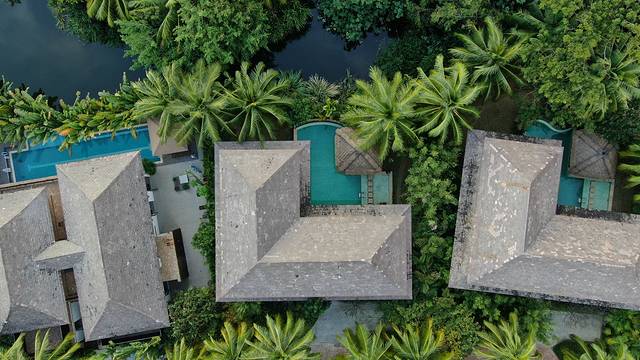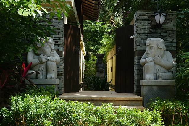 酒店建筑风格汲取巴厘岛及东南亚建筑精华,将建筑主体适当分离,室内室外互融,通透敞亮。庭院内莲花池引路,泳池、草亭、连廊等错落有致,与主体建筑交相辉映。露天浴室,巧于结合,室内外相互贯通、穿插却又不失私密性――“坐享一湾海边的 香格里拉 ,沉醉一个世外的人间瑶池。”