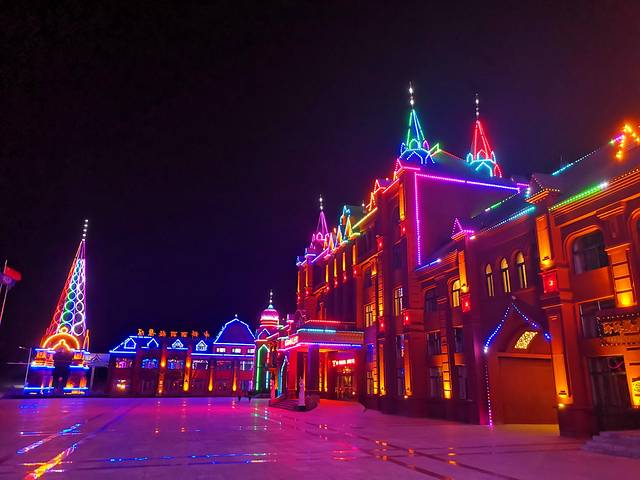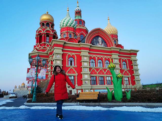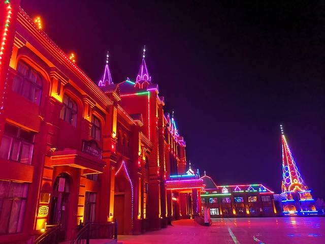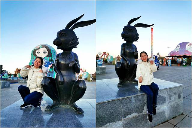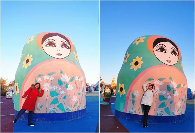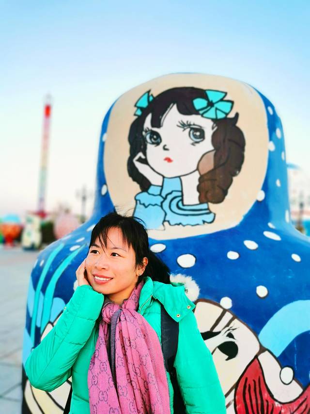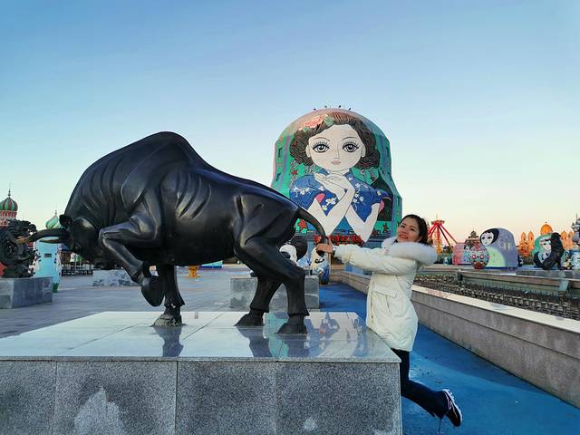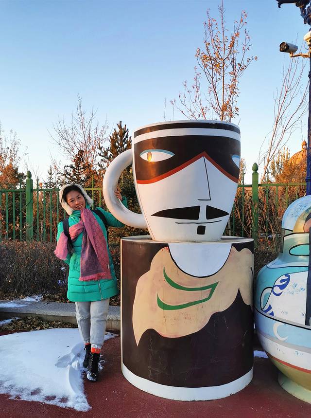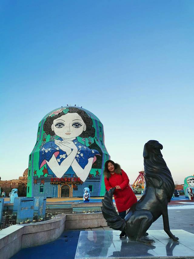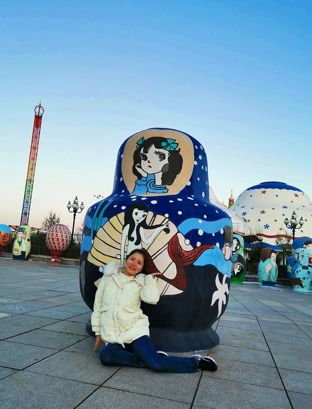 逛完国门景区,去当地有名的诺敏塔拉奶茶奶茶店吃过午饭,商量着先回去睡个午觉才去套娃景区,这到好,一觉睡到下午三点多,等收拾好出门已经四点了,出门还是大太阳,一到景区就变成只剩下夕阳了,五点准时天黑从不晚点。主题演艺没看到,主题娱乐没玩到,主题酒店被吉宝说金玉其外抛弃了,不过没关系,还有那么多可爱的套娃呢,再冷也要合个影。