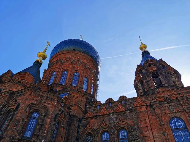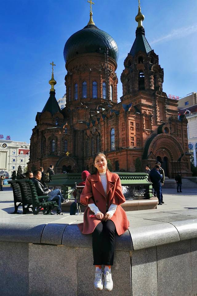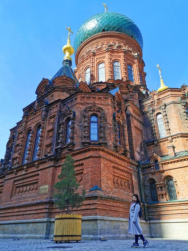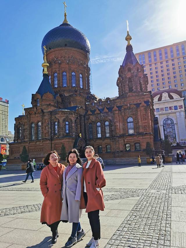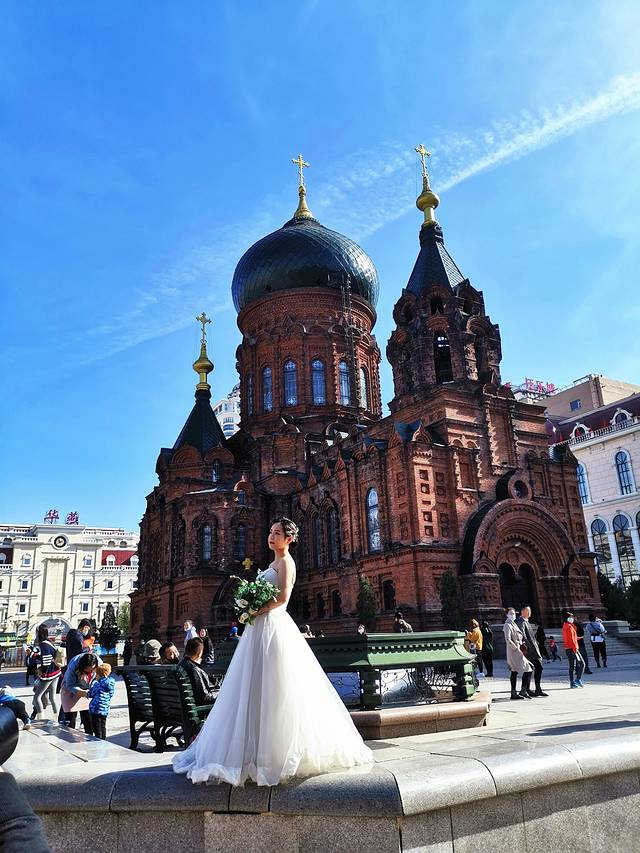 吃过早餐太阳出来了,我们才敢出门溜达。第一站是圣索菲亚大教堂,圣索菲亚大教堂是一座始建于1907年的拜占庭风格的东正教教堂,是全国重点文物保护单位。教堂前拍婚纱照的夫妻、手牵手的情侣,都让我们感受到了些许浪漫。