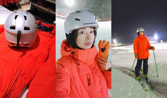 第二次滑夜场,这次租用了一套滑雪服和头盔,想着要是摔跤还能保护到头部,这样心里还有个安慰,敢于放开一点点。衣服是很保暖而且防水,虽然租的最小号,但是还是有一点点大,但是比长款羽绒服好一点。