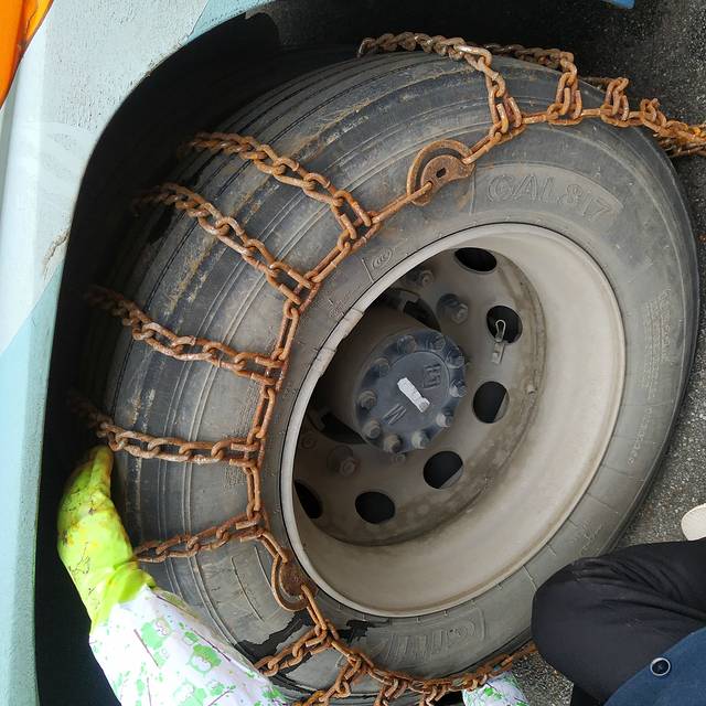 因为后面的路非常蜿蜒,道路可能结冰,为了安全要给4个轮子都装上防滑链,司机师傅很专业,全程一个人完成了4个轮子的防滑链安装,没有其他人协助,我是第1次看到防滑链长什么样,感觉很新鲜,所以下车用相机记录了一下,这个铁链子真的很厚很重,装在轮胎上为了能更能增加摩擦力,以防车辆发生侧滑。
