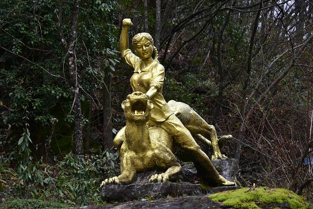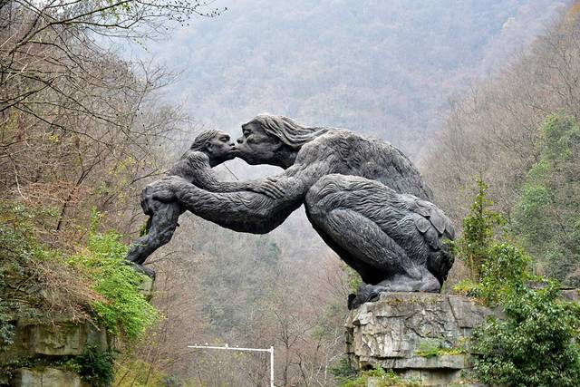 进入官门山景区,我就被大门吸引震撼了,这是一组主题为母爱的野人母子雕塑,野人妈妈正在亲吻小野人,超有爱!