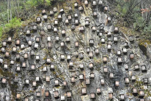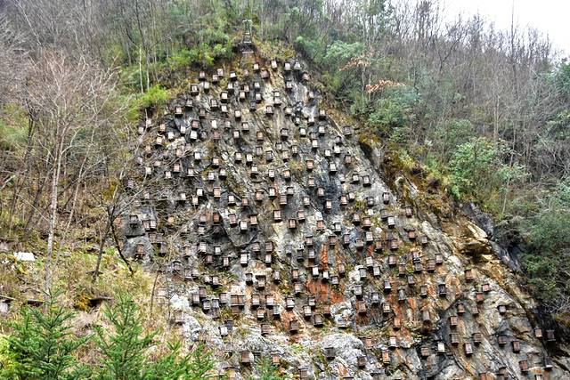第一次看到悬崖上的峰园,偌大的山壁上层层叠叠,悬挂的是数不清的长方形蜂箱,超级壮观,这里是濒临灭绝的中华小蜜蜂饲养地,在神农架林区存在广泛的高山草甸上,在巴山冷杉原始森林中,都可以看到他们的匆忙身影,神农架小蜜蜂采百花,蜂蜜品质很高,非常珍贵,神农架的小蜜蜂还是本地独有的,它们离开神农架就无法生存。