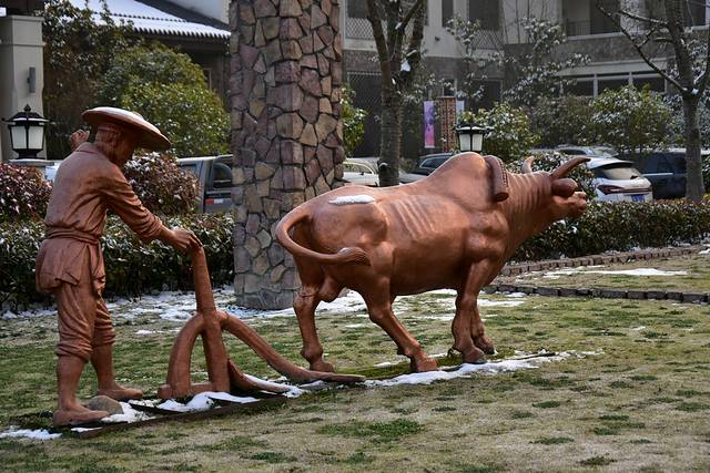 酒店门口有一个农夫驾驭黄牛耕地铜像