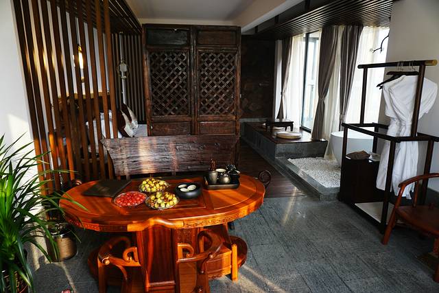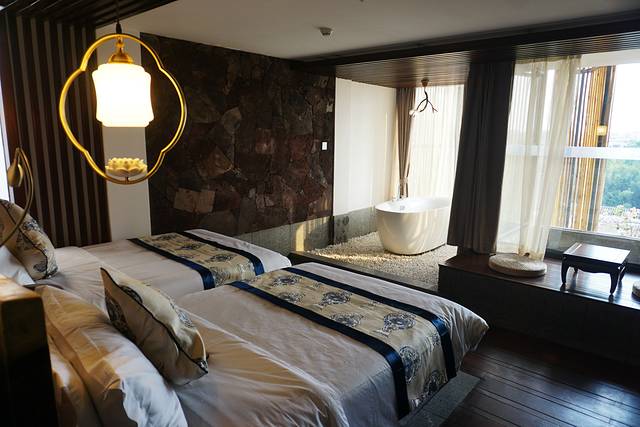 走进去,客房元素都是以实木和石头为主设计的。整个房间古色古香,大床看上去就软软的,很舒服,再搭配上暖黄色的灯光。夏夏一家住的房间是民宿的亲子房,和其他房间不同的是,它还配置了一个供小朋友玩耍的小帐篷,除此之外,还有一个落地窗,早上阳光会洒进来。但是听店员说,部分房间还配置了小型榻榻米、大型落地窗、按摩浴池等设施,所以想要过来住宿的小伙伴要记得先询问清楚再下单~夏夏一家对这家民宿还是挺满意的,即满足了夏夏所需要的文艺风,孩子也能住的开心,玩得舒心~