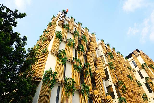 我是入住的第二天过去串门的,从外观上看就已经足够吸引眼球,竹制的墙面让大隐于市的整体风格具备了强烈的特色,大片原生竹高悬于墙面,再配以绿植点缀。进门处开始,每一个角落都透露着经营者的用心,老石磨做成的人行道、中国传统木门设计成的屏风、年代感十足的马车……民宿里面的装修独具特色,充满了民谣神韵、香格里拉色彩。