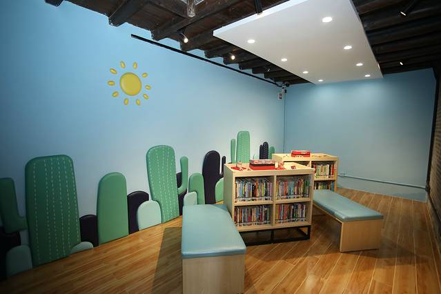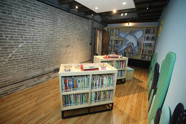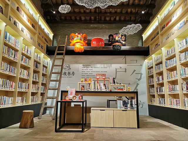 一行十人在吃饱喝足后决定要逛逛周围的文化圈,大家各自在手机上搜索,商量之后决定去24小时深夜书房。这是一个免费书房,且24小时不打烊。它建在一所百年青砖房里,需要刷身份证才能进去,里面还设有阅览室、儿童区、休息室。书房内有多种非遗元素,有狮头、鼓、泥塑……内部同样能看到岭南传统建筑的影子。书房门口一台ATM图书借阅机,简单几步就能完成借书手续。这台自助借阅机是和广州市图书馆联网的,大家也不用害怕一定要回来深夜书房才可还书。孩子们在儿童区翻看历史书籍、成语故事等儿童读物,大人们则有的在阅览室选择读物,有的在休息室稍作休息,去打卡的小伙伴注意保持安静~