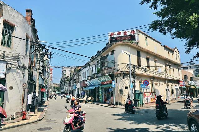 大大小小有六百多栋几层高的小楼,是上世纪南洋归国华侨借鉴南洋风格建筑返回家乡所建。得胜沙路是海南最大的服装批发市场,新华南路有传统的裁缝店、平民服装鞋店、茶楼、小食店。中山路分布着咖啡馆、画廊、工艺品店等。博爱路街边小店销售家电、小商品等,周边还有不少小吃。
