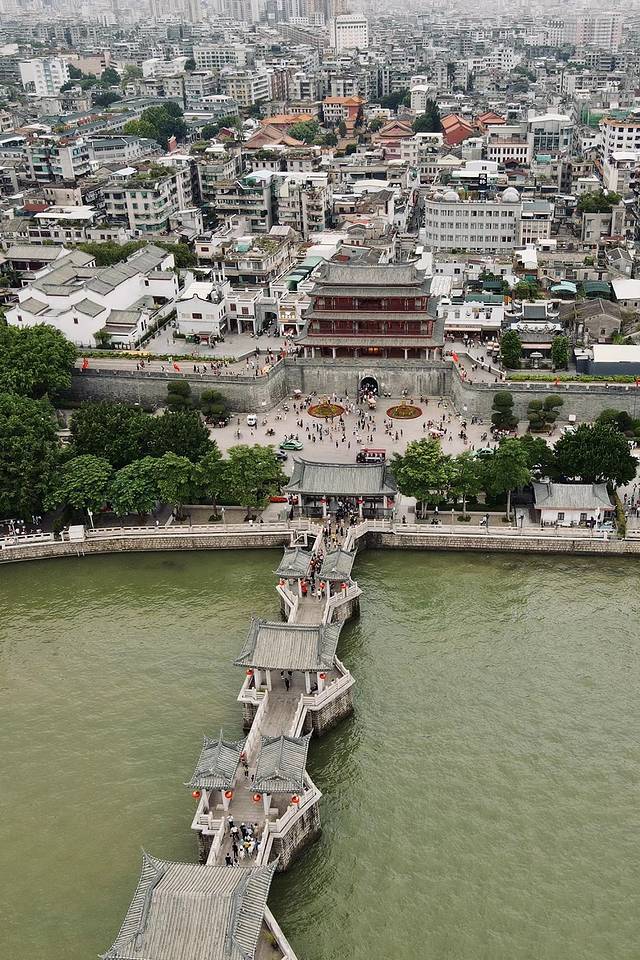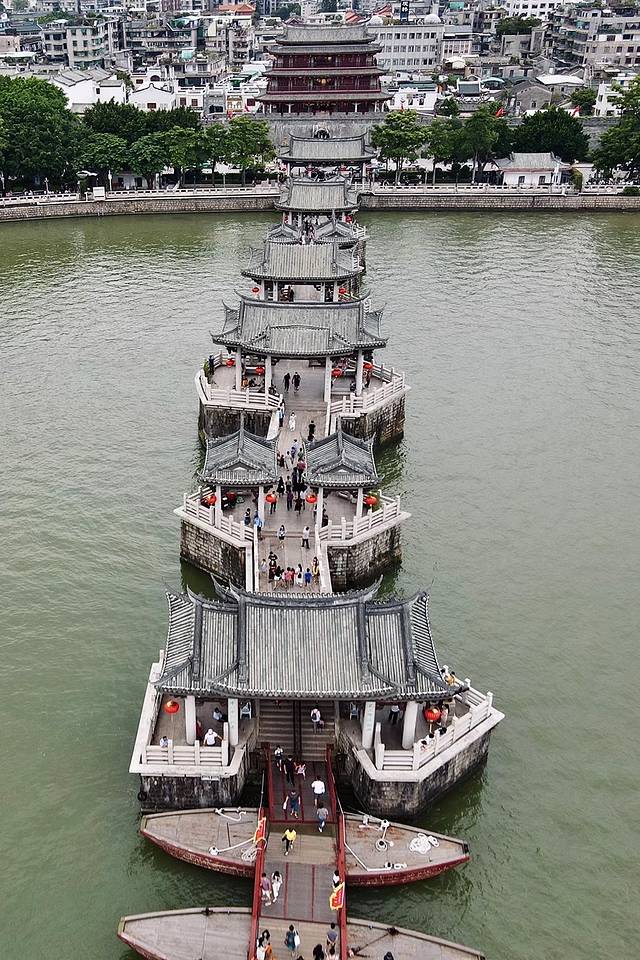 站在韩江江边便能感受到广济桥的恢弘气势,两边为石墩,桥墩上建有精美的楼台亭阁,中间由18座古浮桥相连,梁舟结合,刚柔相济,在上面走一走,别有一番趣味。