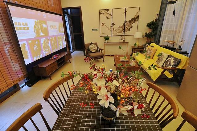 别墅配有全套的厨房,齐全的餐具厨具。客厅里有一个110寸的投影,投影点播随心所欲,家庭影院。