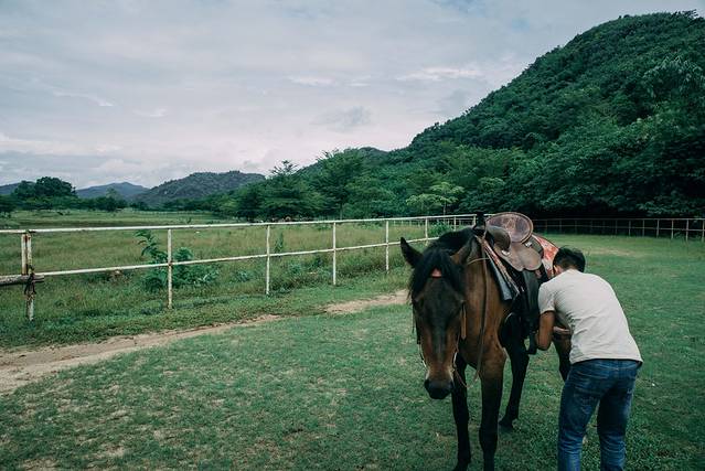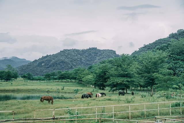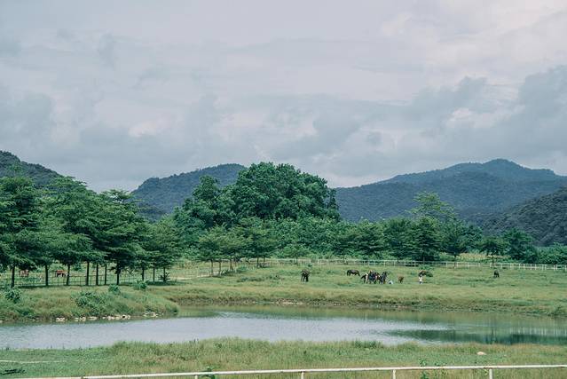 在欣赏完瀑布的壮观景象之后,来到罗帅雨林休闲山庄,它紧邻黎村罗帅仙女溪,空气清新,每立方分米负氧离子高达万个,是个名副其实的热带天然大氧吧。在罗帅雨林山庄天涯驿站休整一晚,第二天来到那 吉马 术俱乐部体验,蓝天、绿树、青草、湖水和骏马,恍惚间觉得自己摇身一变,成为古时武功超群,正气凛然的游侠,就差一把配剑。