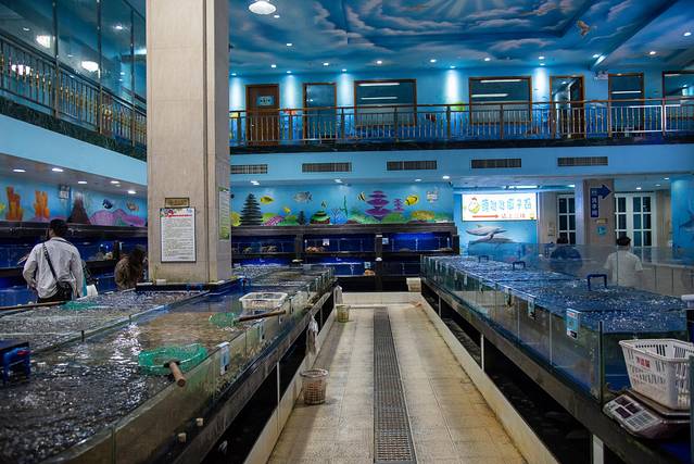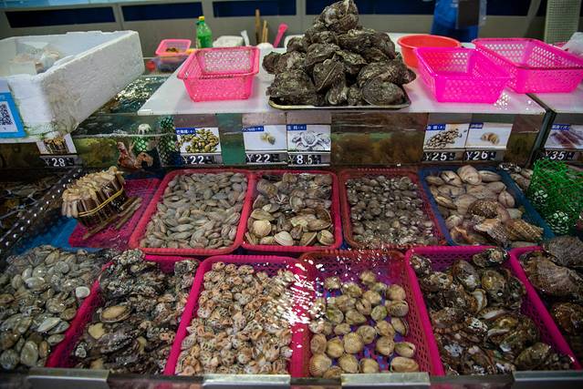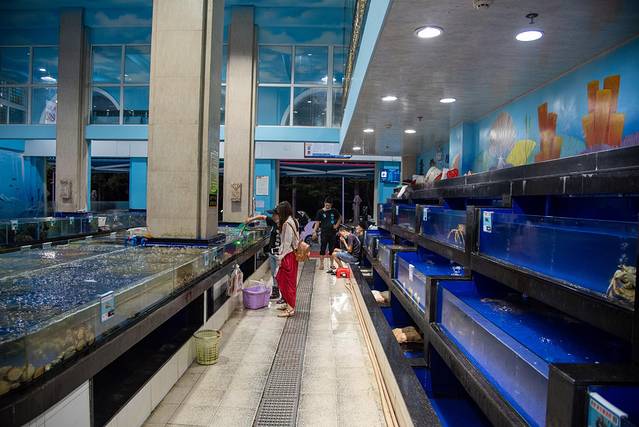 这可以算得上三亚最大的海鲜加工综合广场了,蓝色建筑加蓝色的装修加鲜活的海鲜,让人感觉仿佛置身于大海。餐厅就在三亚湾的海边,可以在三亚湾看完日落,再进店吃海鲜。小海豚海鲜广场可以直接点菜,也可以在一楼购买海鲜加工,我决定自己在一楼挑选,体验下三亚买海鲜的乐趣。