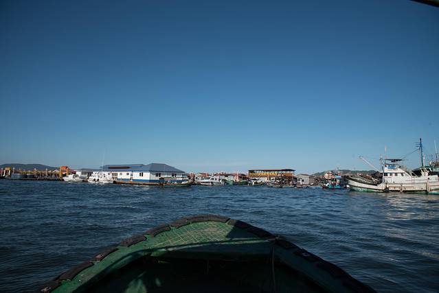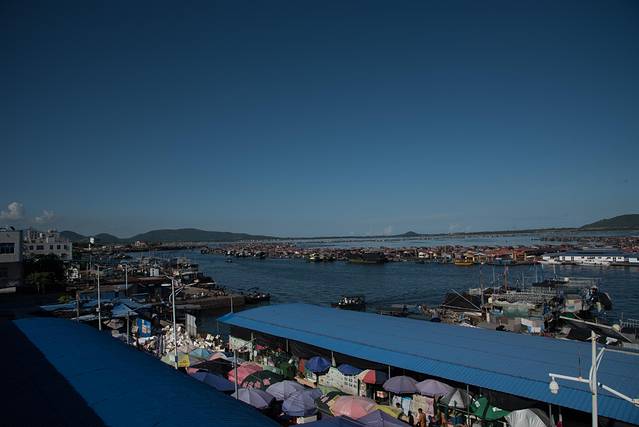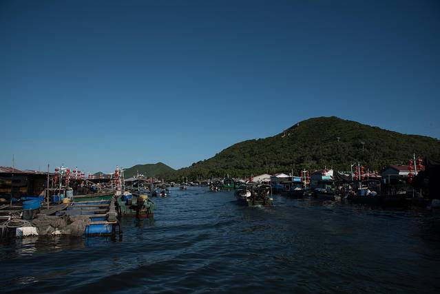 这里三面环海,风光旖旎。小海港坐落着一千多户的疍家人,他们世代生活在海上,700年来代代相传,从码头望去,冬眠宽阔的新村港上密密麻麻浮着一大片小木屋,每座房子的四周都浮着呈井田状用于养殖水产品的网箱,就是所谓的“渔排”。千家渔排聚集在一起,如同水上城市。