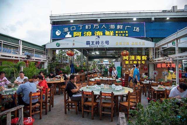 周围的海鲜加工店也非常多,我选择了一家招牌显眼的阿浪海鲜,进去之后发现店内的装饰很有海南特色,简单轻松,有点大排档的感觉。