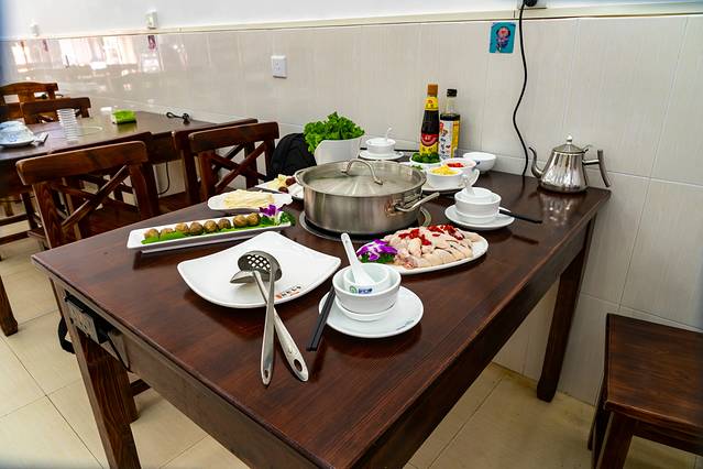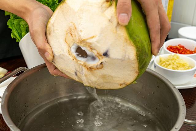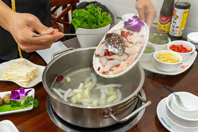 先吃鸡肉再喝汤,鸡汤一定要在涮其他配菜之前,先盛出来一碗喝,这个时候的鸡汤才是原汁原味的最纯正的椰子鸡汤。
