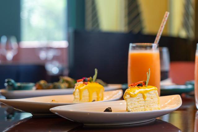 这个榴莲千层,两份都不够吃,最少人均两份起!不信你来试试看!选用海南本地的新鲜榴莲打成榴莲汁铺在千层上,很软很糯很新鲜,而且一入口即化,榴莲的香味儿和整个甜品的甜味在味蕾上肆意绽放,这真的是我最近一段时间吃过最好吃的榴莲千层,没有之一。