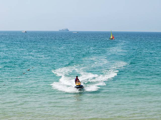 沿着海岸线向西走是躺椅区,在这里休息的基本上也是一色的外国友人,躺椅区正对着的沙滩上,海上摩托,帆船,潜水等海上游玩项目的起点处。其实如果时间充足完全可以在这个 大东海 的沙滩上呆一整天,不为到处逛逛,只为了慵懒的享受阳光,毕竟在现在这种快节奏的生活中,能有一个放松的机会很是不易,怎么能不珍惜呢?
