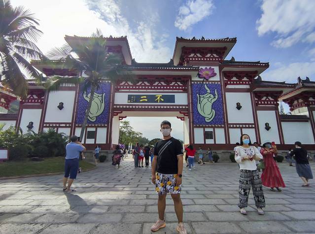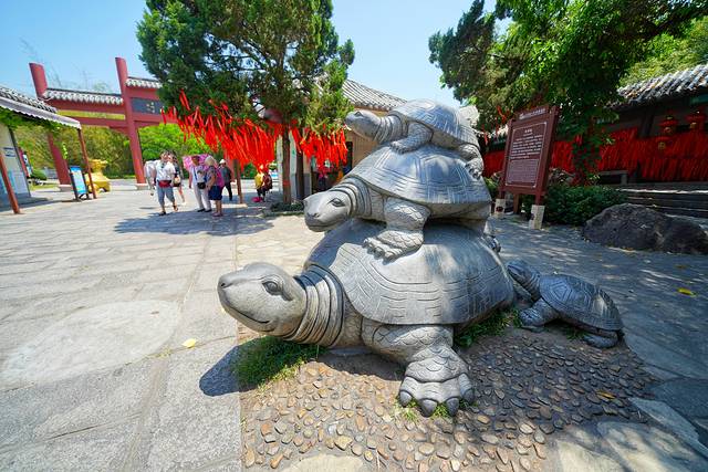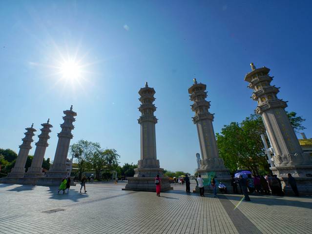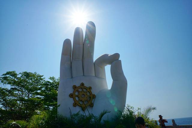 小火车第一站就是南海观音,下火车后还需要走一段路,进入到前往南海观音大殿的廊桥,从大殿就可以走到南海观音的脚下,在这里会看到有很多人在抱佛脚祈福,这里也是三亚旅游景点的一个地标。