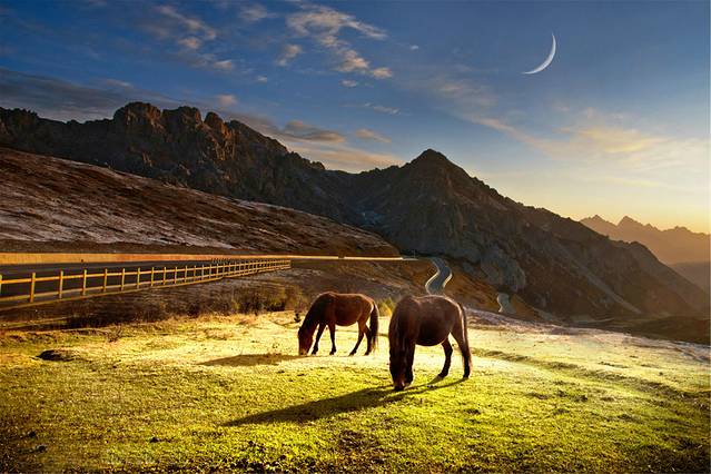 这里也号称是“摄影天堂”,是无数摄影师心目中的风景圣地,这里有着数不清的诱惑和美景。湛蓝的天空、连绵的山峦、无边的草原、潺潺的溪流、山坡上觅食的牛羊、远处散落的藏族村寨、说是人间天堂,一点也不过分。并且过了新都桥还会遇见著名的天路十八弯,感受川藏线上道路的兜兜转转和人为的力量。