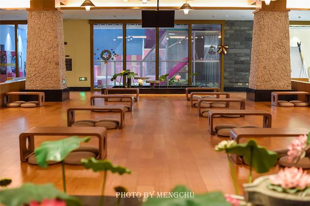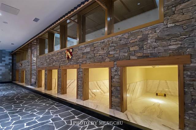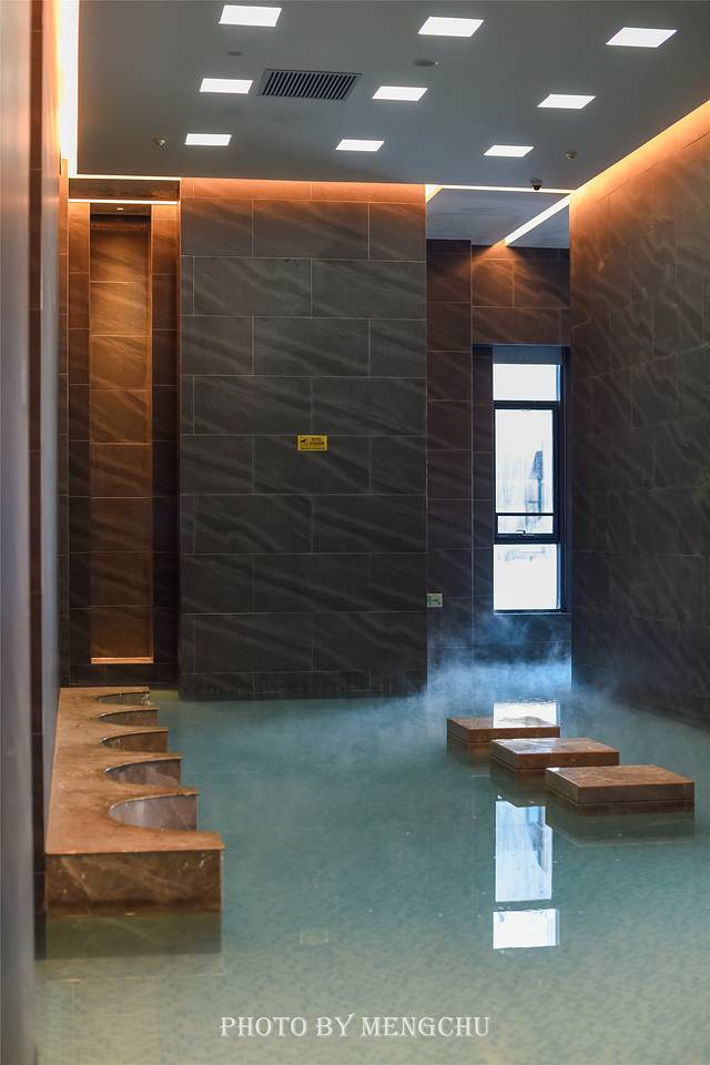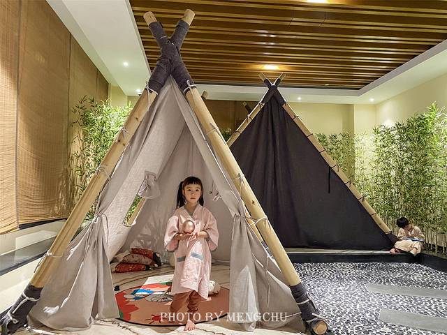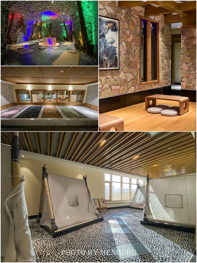 二层是汗蒸区,在汤池泡累了可以穿着汗蒸服上楼小憩,设有玉石休息平台、5间多功能汗蒸房,还有各种窑洞、帐篷区、儿童淘气堡、餐厅和水吧等,带来私密舒适的高雅体验;