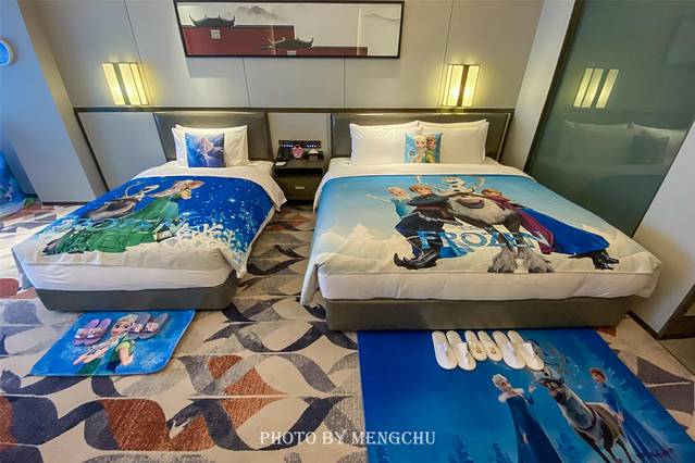面向亲子家庭,酒店还有精心布置的亲子房,有大嘴猴、小猪佩奇、冰雪奇缘、开心超人、汽车总动员和漫威等多个主题,小丫头自然选择了她最爱的冰雪奇缘。
