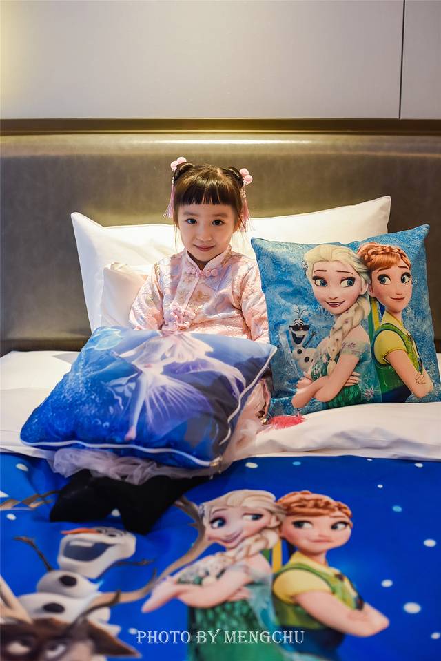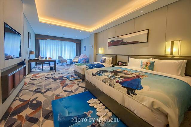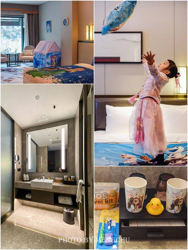 亲子房虽然住过不少,但是布置得如此用心的却不多,各种布草、大到帐篷床旗、小到拖鞋闹钟,全部都是冰雪奇缘系列的,还贴心的准备了儿童的全套洗漱用品,真的是相当贴心了!小丫头一进门就开心得蹦起来,只想窝在自己漂亮的房间里哪儿都不想去……