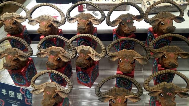 普者黑村里的旅游记念品小店,这个木刻牛头是当地特色。
