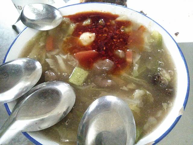 肉丸糊辣汤味道比较淡,加上了一勺子辣椒油之后才觉得有颜色多了。