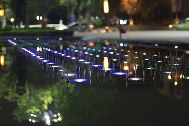 夜晚的音乐喷泉很漂亮,也很热闹。