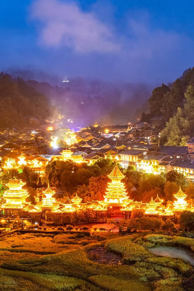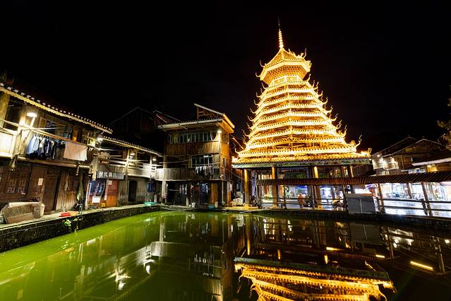 肇兴侗寨的大门就是摆渡车的终点,下车就看到侗寨的夜景,瞬间被夜景惊艳到。面对美景我们瞬间亢奋起来,放下行李就跑出去拍摄了。