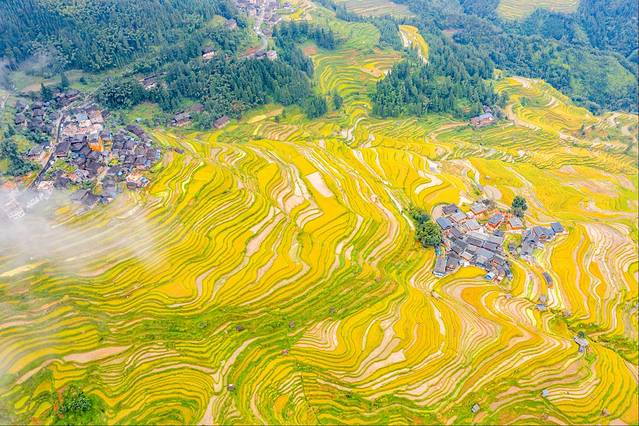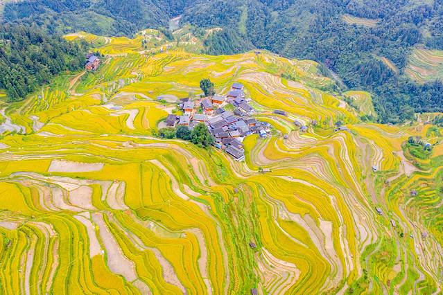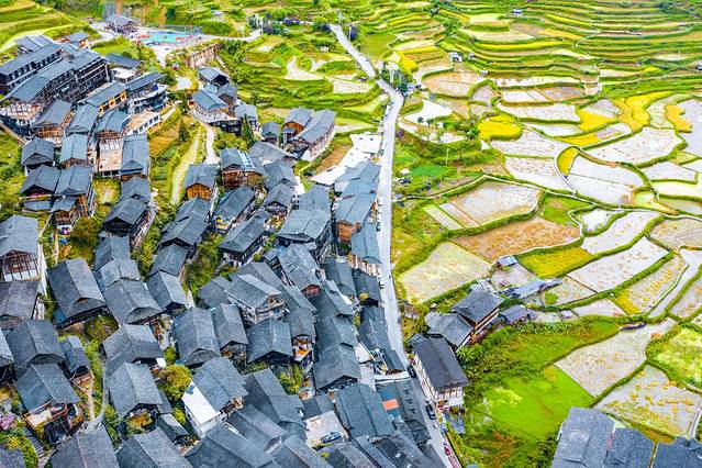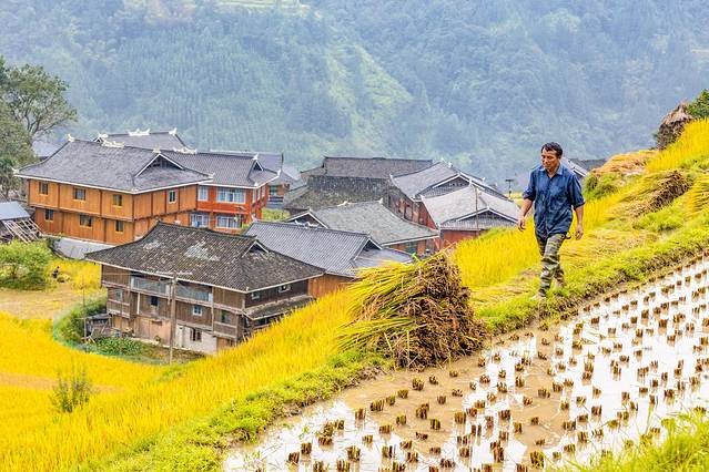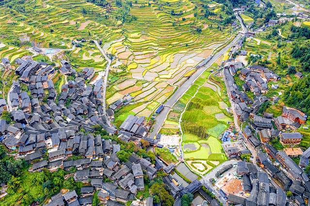 加榜梯田位于苗族侗族自治州从江县西部月亮山腹地的加榜乡东北面,距县城80公里,我们从肇兴侗寨过去需要先经过从江县城。加榜梯田也是中国最美的梯田之一,梯田里散落着苗乡特有的吊脚楼。