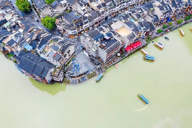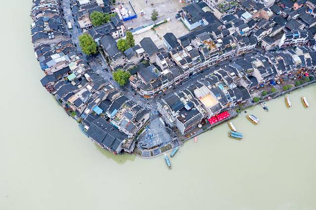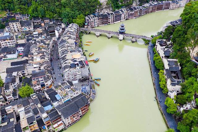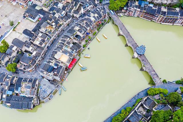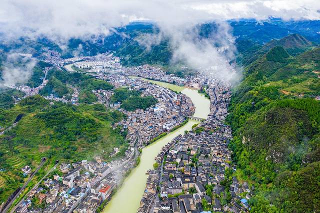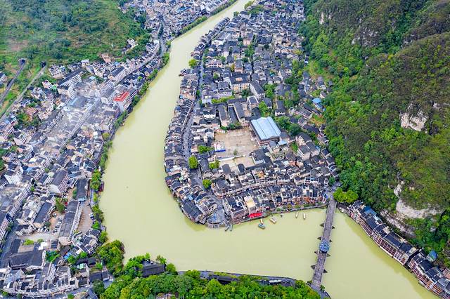 绕城而过的㵲阳和已流畅的S型利落的将整个镇远古城一分为二,巧妙地在天地间勾勒出一副阴阳八卦太极图,而镇远的府城和卫城就是太极阴阳两点。航拍下的镇远古城现在已经规模很大。