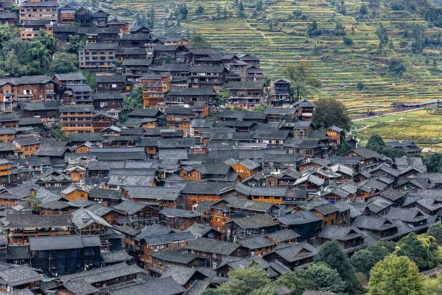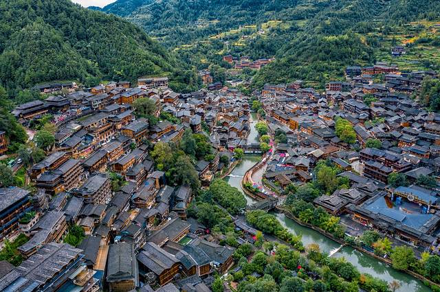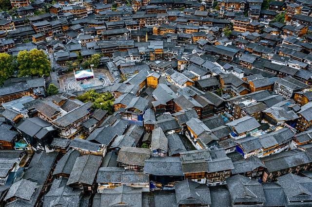 西江其实整个苗寨规模很大,航拍下的西江苗寨还是很壮观。西江苗寨是全国最大的苗寨,有1200余户,6000余人,苗族占99.2%。四周群山环抱,层峦叠翠,一条小溪从雷公坪来,穿寨而过。幢幢吊脚木楼依山而建,层层梯田顺着山势紧连云天。