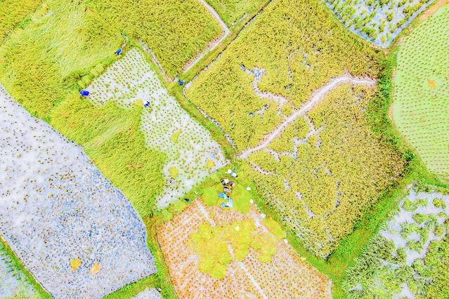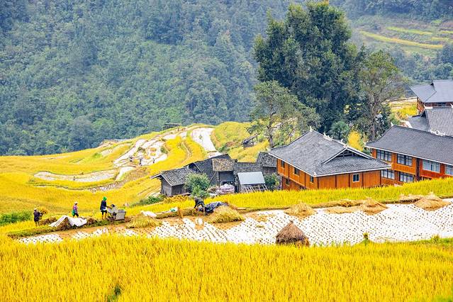 加傍梯田的秋收